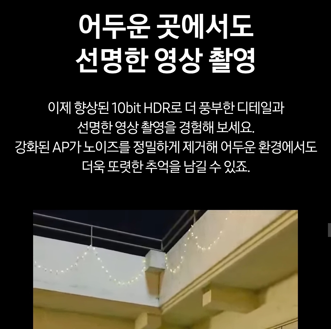 - 야간 촬영: 빛 번짐과 노이즈 억제, 선명한 야경 구현