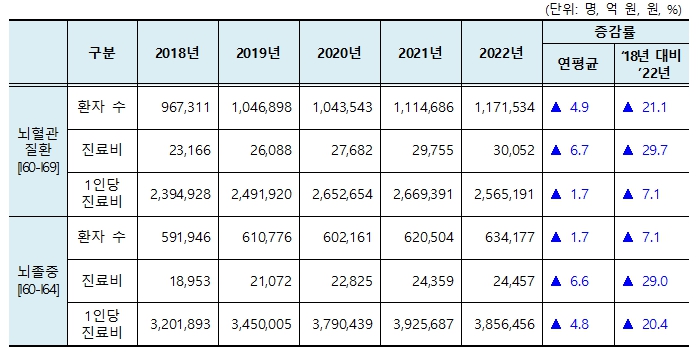뇌졸중 환자의 연간 진료비가 29% 증가 1인당 진료비는 20.4%가 증가