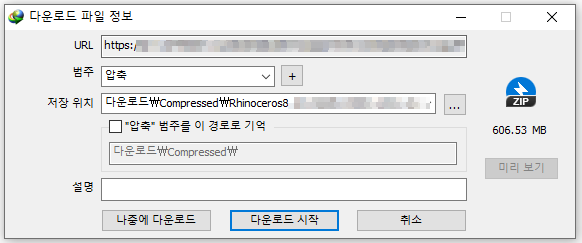 용량은 대략 606MB정도로 확인이 됩니다. IDM을 사전에 설치 된 분들은 위와 같이 받을 준비가 된 것입니다. 이제 "다운로드 시작"을 눌러 진행합니다. 다운을 받는 다고 해서 설치가 쉽게 되는 부분이 아니기 때문에 설치 방법에 대해서 설명드리겠습니다. 설치가 완료 되었다면 아래 반디집을 이용해 압축을 해제하여 줍니다.