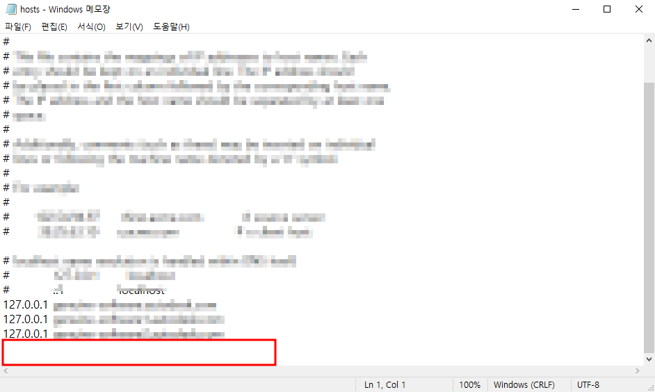 혹시 모르니, 호스트 원본파일을 따로 복사해서 빽업해두세요.