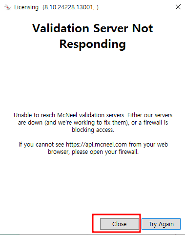 그런다음 해당 키를 복사하여 넣어주고, 다시 실행해줍니다. 그러면 또 연결할 수 없다고 나옵니다. 다시 " close"를 눌러주고 창을 닫아줍니다. (모든 과정을 마쳤습니다.) 만약 그래도 안된다면 댓글을 달아주세요.