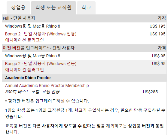 또한, 해당 버전은 최신버전입니다. 그러나, 소프트웨어를 사용시에는 단순한 연습에 국한된다는 점이며, 이를 상업적 또는 기업, 별도의 학생용으로 사용할 수 없는 부분이 있으니 이점 참고하여 주시고, 지극히 개인적으로 충분히 연습하시고 손에 익히신 다음 유로 결제를 통해 해당 제품을 등록하시는 것을 권장합니다. 따라서 현재 진행되고 있는 라이노 홈페이지를 통해 평가판과 동일시 하다고 보면 되며 아래 내용을 참고하시면 좋겠습니다.(라이노가 처음이시라면 다양한 기능과 정보를 볼 수 있습니다.)