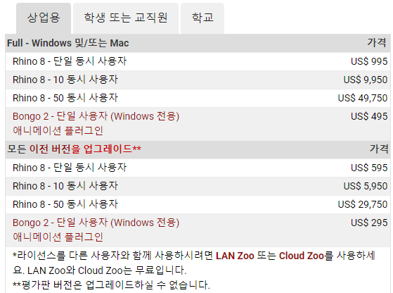 또한, 상업용, 학생 또는 교직원, 학교등으로 구분하여 플랜을 제공하는 있는 점 참고바랍니다.