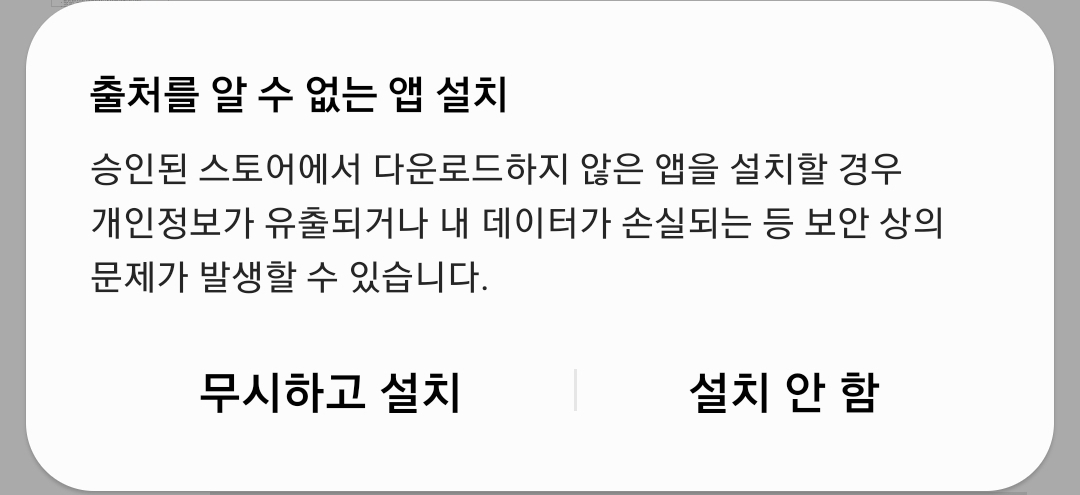 "출처를 알 수 없는 앱 설치" 경고 화면이 뜹니다. 무시하고 설치를 눌러줍니다. 그리고 스토리지 관련 질문을 하고 허용, 허용안 함을 선택하라고 나오는데, 허용안함을 누르면 설치 과정에서 오류가 날 수 있습니다. 이어서 알림 허용은 " 안함 "을 체크하거나, 받기를 원하시면 " 허용"을 누르세요.