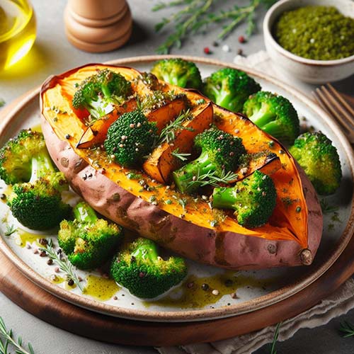고구마, 브로콜리 등 야채를 구우면 본연의 단맛이 살아나 더욱 맛있어집니다. 풍미 폭발을 위해 올리브 오일과 좋아하는 허브를 뿌립니다.