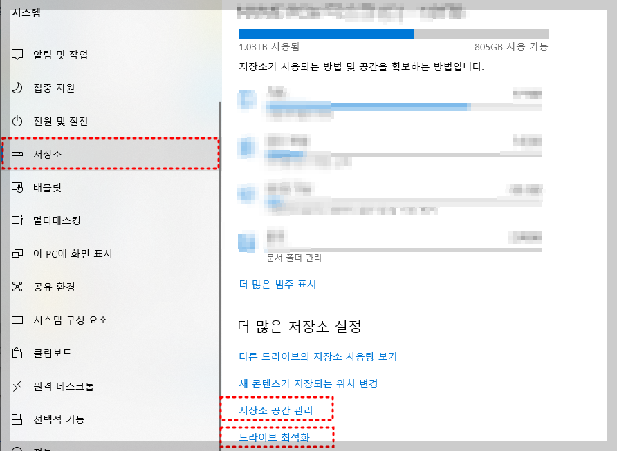 이때 저장소를 선택합니다. 그리고 "저장소 공간 관리" 또는 "드라이브 최적화"가 있습니다. 저의 경우 드라이브 최적화를 선택하고 진행을 하였구요. 사용자마다 진행 속도는 다를 수 있는데 저는 금방 끝나는 캐이스였습니다.