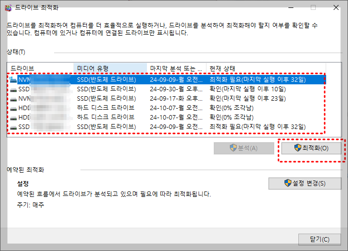 이 상태에서 저장소 공간관리의 경우는 내가 특정해서 앱 하나하나 선택하여 작동 안하게 하거나 삭제하는 방법이 있지만, 아무래도 드라이브 최적화가 일괄적으로 해결되는 부분이 있고 불필요한 캐쉬와 데이터를 기본 윈도우에 맞게 정리해주어서 이것을 선택하였습니다. 그리고, " 최적화 " 버튼을 눌러주시면 됩니다. ( 아마 금방 정리가 될 거에요. )