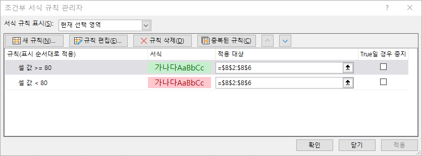 참고사항: 규칙을 설정하게 되면, 셀 화면에서 글자색을 수정해도 바뀌지 않습니다. 그 이유는 규칙에서 글자색이 정해져 있기 때문에 글자색을 변경하려면 조건부서식의 규칙편집에서 글자색을 변경해야 합니다. ( 이해가 되셨나요? )