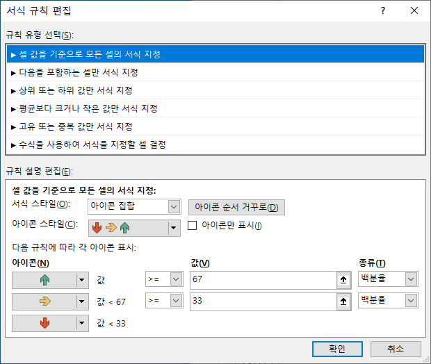 아이콘 집합을 더블클릭하면 위와 같이 나오는데요. 화면 아래에 값(v)부분에 67, 33으로 되어 있는데 이를 자세히 보면 오른쪽에 백문율로 나와 있습니다. 따라서 상위 67%이상은 위쪽 화살표, 33%이상 67%미만은 오른쪽 노랑색 화살표, 33%미만은 아래빨강 화살표로 표기가 됩니다. 종류(T)영역을 변경해서 원하는 형태로 하실 수 있습니다.
