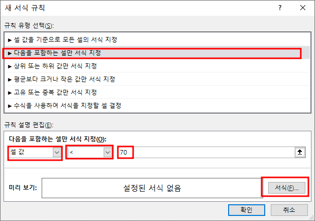 셀값 선택, 화살표(<  셀값이 70 미만이라는 뜻입니다. ), 그리고 서식(F)를 눌러줍니다.