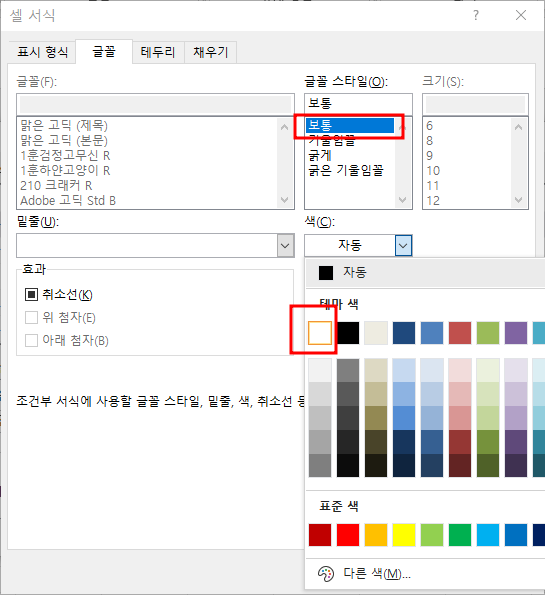 참고사항: 규칙을 설정하게 되면, 셀 화면에서 글자색을 수정해도 바뀌지 않습니다. 그 이유는 규칙에서 글자색이 정해져 있기 때문에 글자색을 변경하려면 조건부서식의 규칙편집에서 글자색을 변경해야 합니다. ( 이해가 되셨나요? )
