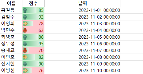 그리고 끝으로 점수와, 상위 하위 %가 적용된 규칙과, 데이터막대, 아이콘이 모두 적용된 예시 파일을 아래 첨부합니다. 다운로드 받으시면 되요.