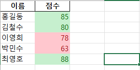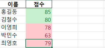 79를 입력하고 엔터를 치면, 색상이 빨갛게 표시가 됩니다.  조건부서식 80이상 녹색, 80미만 빨강색으로 제가 설정을 해놓았기 때문이지요. 여러분도 한 번 테스트 해보세요. 그리고 조건부 서식이 어떻게 적용되어 있는지 확인해보겠습니다.
