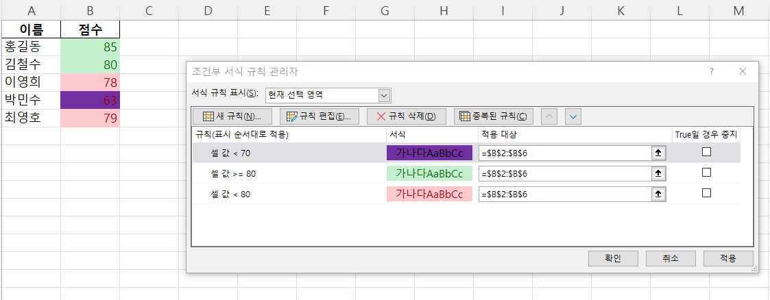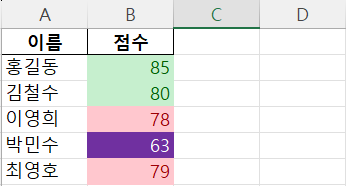 그런데 위에서 제가 설명드린 것 처럼, 70점 미만의 점수의 글자색이 검정색이라 보라색 배경과는 맞지 않습니다. 그래서 규칙편집으로 들어가 글자색을 수정해주어야 합니다.