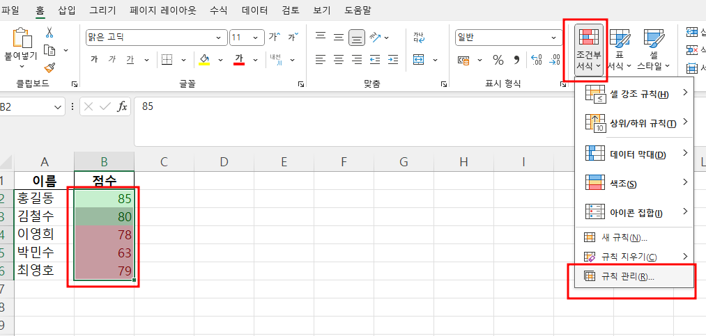 서식에서 점수 영역을 마우스로 드레그해주세요. 그리고 홈 텝 영역을 선택하고, 우측을 보면 " 조건부 서식"이 보입니다. 눌러주시고 그 아래 "규칙 관리"를 눌러줍니다.