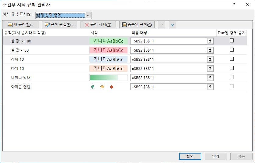 이렇게 확인이 되실겁니다. 셀강조 색상에 대한 부분은 역시 위의 내용을 참고하면 되겠구요. 상위 10%, 하위 10%로 설정되어 있는데, 현재 규칙이 많이 적용되어 있어서 가려져서 안보이고 있습니다. 그래서 필요 없는 것은 지우고 테스트 하시면 되겠습니다.