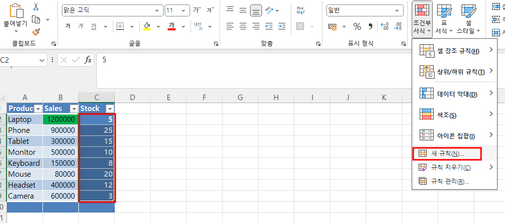 아까와 같이 stock영역을 드레그합니다. 그리고 조건부 서식의 새 규칙을 눌러줍니다.