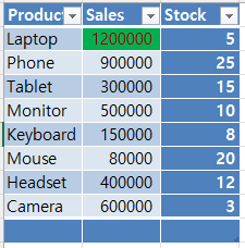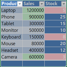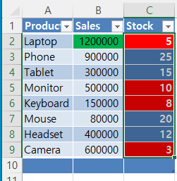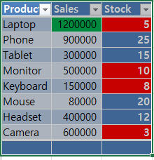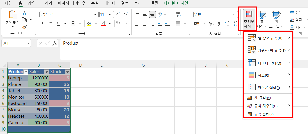 이렇게 최종 결과값이 적용 되었습니다. 이렇게 함으로써, 같은 판매 데이터에서 월간 매출이 특정 금액을 초과할 때 자동으로 서식이 적용되도록 설정되어 있습니다. 또한, 재고가 적은 항목에 빨간색으로 경고 표시가 되어 있습니다.