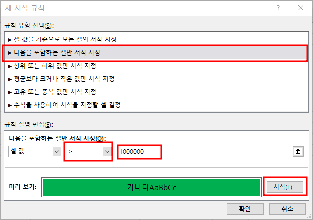 그러면 이런 화면이 뜹니다. " 다음을 포함하는 셀만 서식 지정"을 누르고, 셀값 오른쪽에 화살표 선택, 숫자 입력을 합니다. 숫자보다 셀 값이 클 경우 어떻게 보여줄거냐를 설정하는 것입니다. 여기에서는 초록색으로 표시하기를 선택합니다. 그리고 적용을 누릅니다.