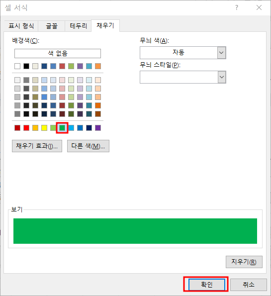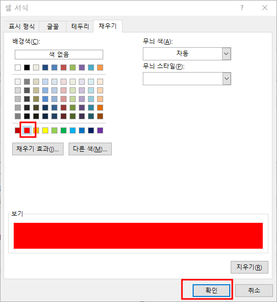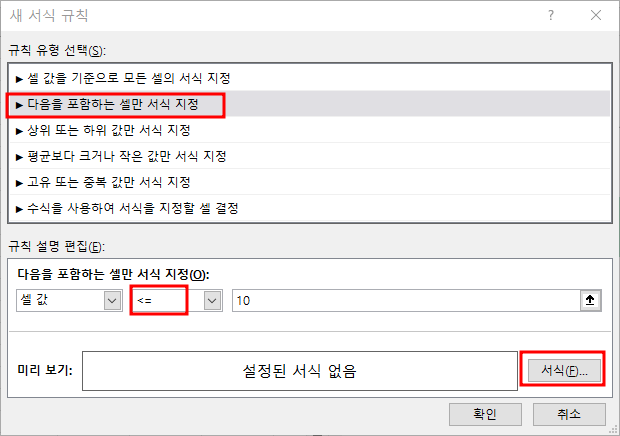 이렇게 빨강색으로 저는 선택을 했습니다. 특히 " 다음을 포함하는 셀만 서식지정" 부분에서 셀값 옆에 부호 표시를 주의하세요. 만약 10 이하일경우라면 " >= " 이렇게 선택하고 서식을 열고 배경색을 선택해주면 됩니다. 그럼 10 이하의 수치는 모두 빨강색 배경으로 바뀌게 됩니다.