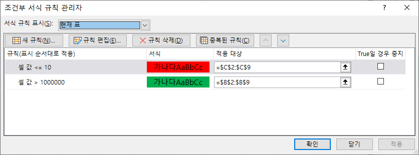위의 조건부 서식 규칙 관리자 화면에서 -> 규칙을 추가하고 싶거나, 변경하거나, 삭제를 하고 싶다면 위와 같이 "새 규칙", "규칙 편집", "규칙 삭제"가 가능합니다. 원하는 바 대로 사용하실 수 있습니다.