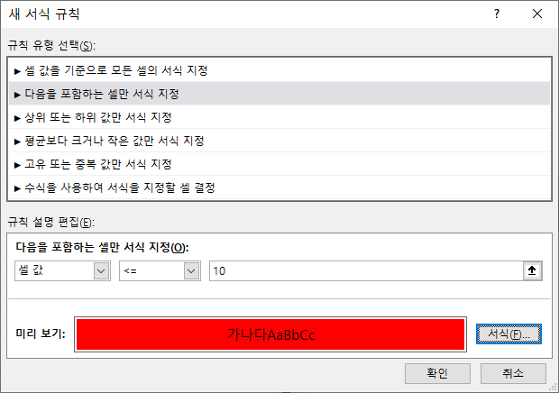 이렇게 빨강색으로 저는 선택을 했습니다. 특히 " 다음을 포함하는 셀만 서식지정" 부분에서 셀값 옆에 부호 표시를 주의하세요. 만약 10 이하일경우라면 " >= " 이렇게 선택하고 서식을 열고 배경색을 선택해주면 됩니다. 그럼 10 이하의 수치는 모두 빨강색 배경으로 바뀌게 됩니다.