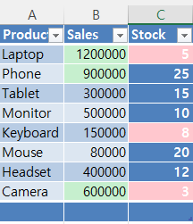 이렇게 최종 결과값이 적용 되었습니다. 이렇게 함으로써, 같은 판매 데이터에서 월간 매출이 특정 금액을 초과할 때 자동으로 서식이 적용되도록 설정되어 있습니다. 또한, 재고가 적은 항목에 빨간색으로 경고 표시가 되어 있습니다.