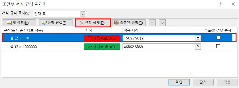 위의 조건부 서식 규칙 관리자 화면에서 -> 규칙을 추가하고 싶거나, 변경하거나, 삭제를 하고 싶다면 위와 같이 "새 규칙", "규칙 편집", "규칙 삭제"가 가능합니다. 원하는 바 대로 사용하실 수 있습니다.