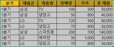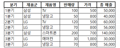 위와 같이 문제 예시를 들어보자면. 이렇습니다. 그림처럼 두 기업은 다양한 제품을 판매하고 있으며, 각 제품에 대한 분기별 판매 데이터를 기록하고 있습니다. 하지만 이 데이터를 효율적으로 요약하여 분석하기 어려워, 각 제품군의 분기별 매출 합계 및 평균을 추출하는 작업이 필요합니다. 특히, 특정 제품군의 분기별 매출 변동을 한눈에 파악할 수 있는 분석이 필요합니다. 위의 그림처럼 제품군을 그냥 삼성과 LG로 했으니 참고하시고, 이렇게 있다고 가정합니다. 그리고 TV, 냉장고, 스마트폰, 에어컨의 제품명이 있습니다.