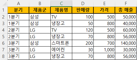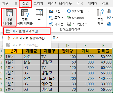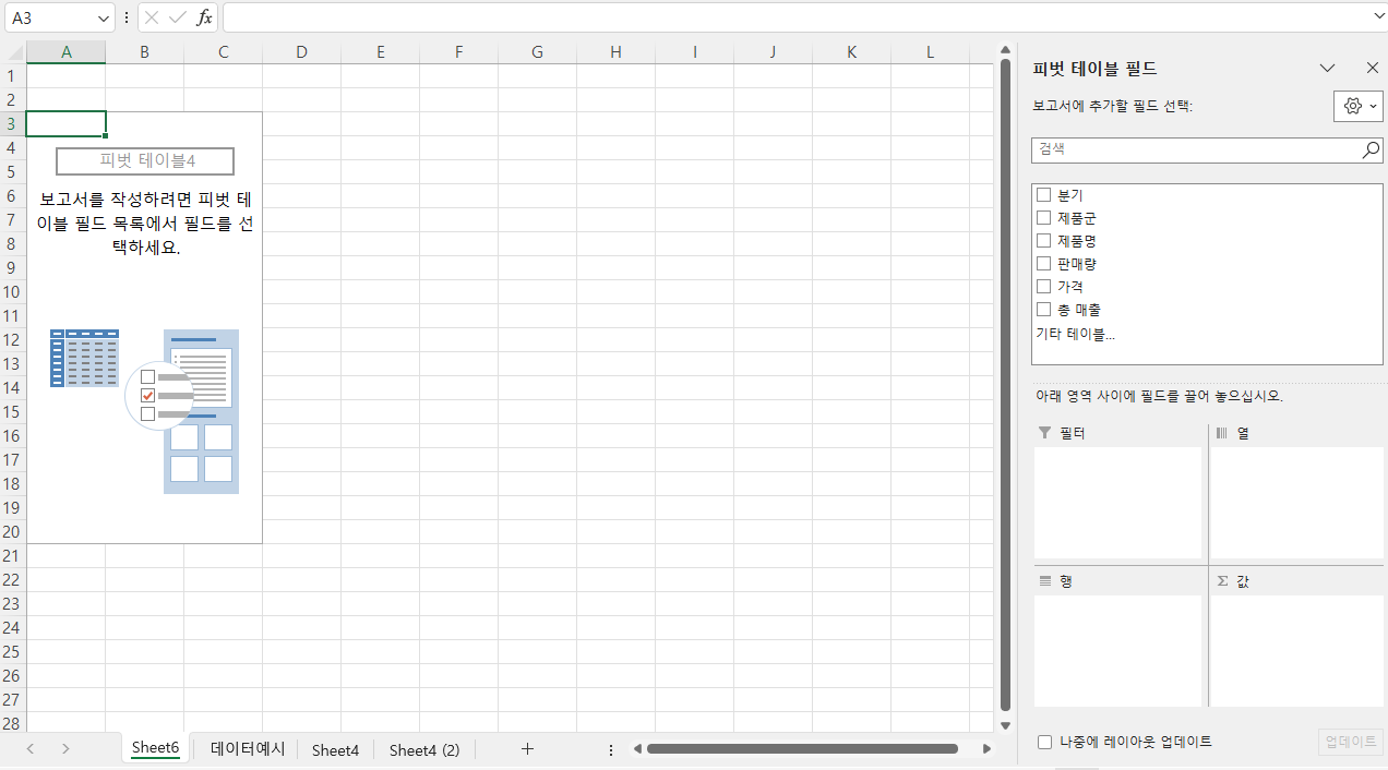 모든 필드 선택하기: 분기, 제품군, 제품명, 판매량, 가격, 총 매출 이렇게 6가지 모두 그림처럼 선택합니다.
