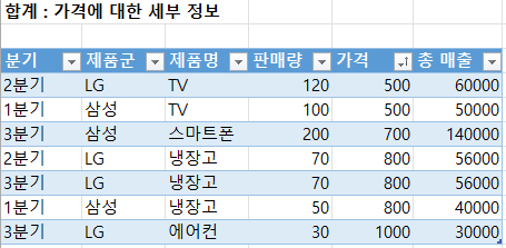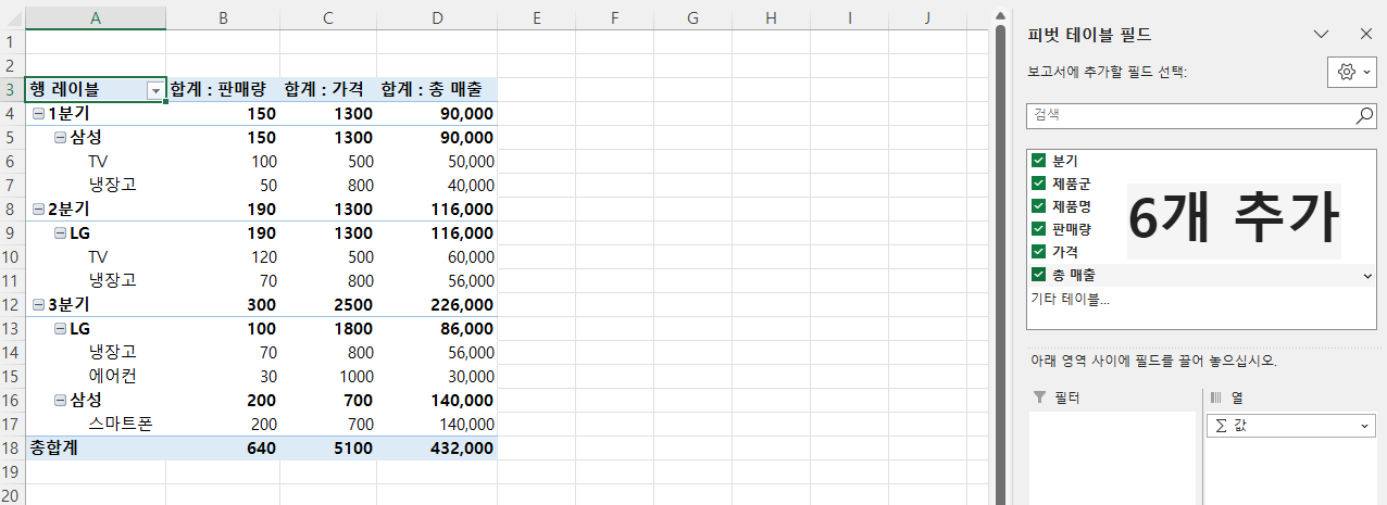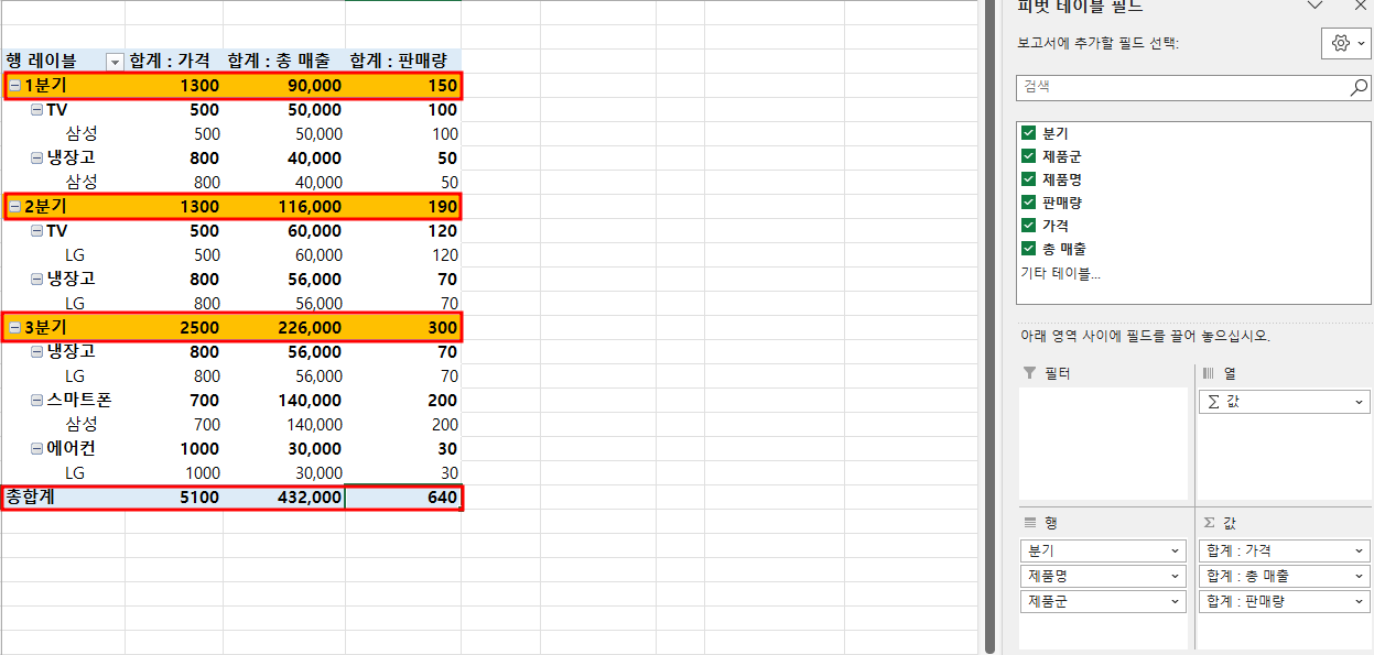 값 필드: '가격', '총 매출', '판매량'을 값 필드에 추가해, 제품군별 분기별 총 매출 합계를 계산합니다.