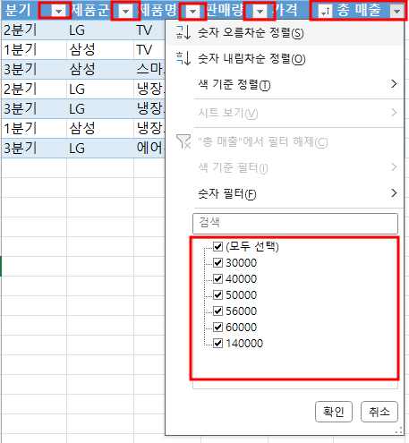 해당 시트가 열린상태에서 '아래화살표'를 눌러서 원하는 목록만 체크해서 볼 수 있습니다.