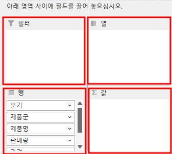 행 필드: '분기'와 '제품명', '제품군'을 행 필드에 추가합니다. ( 분기와, 제품군, 제품명은 행 필드에 있기 때문에 그대로 둡니다. 만약 다른 위치에 있다면 행 필드로 옮겨주셔야 합니다. )