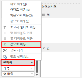 열 필드: '가격', '총 매출', '판매량' 을 값 필드에 추가합니다. 이렇게 데이터를 구분해줍니다.