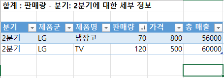 알아보기 쉽게 색을 입혔습니다. 노랑색 부분으로 표시된 영역을 누르게 되면, 새 시트가 열리면서 해당 데이터를 직관적으로 볼 수 있게 됩니다. 예를 들어, 2분기 영역, 3분기영역, 총합계를 각각 눌렀을때 아래와 같이 결과가 보여집니다.