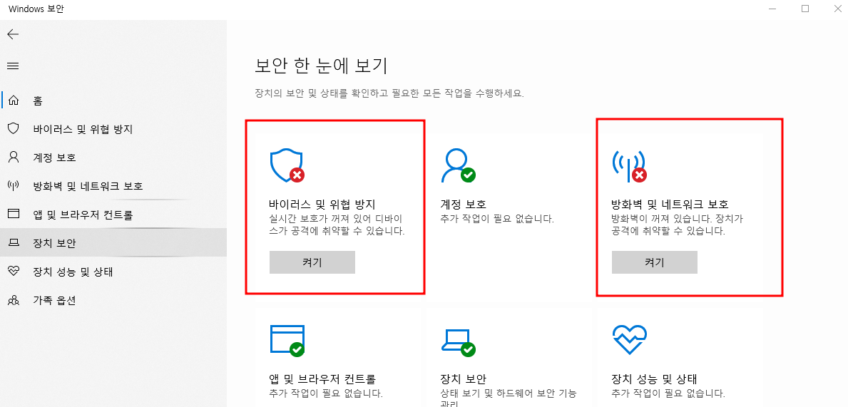 여기서 해제해야 할 부분은 두 곳입니다. " 바이러스 및 위협 방지 " 탭과 " 방화벽 및 네트워크 보호 " 탭입니다. 해제해 보겠습니다. 첫 번째를 클릭하여 이동해 줍니다.