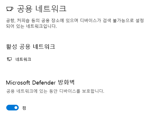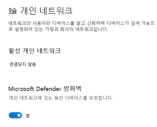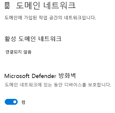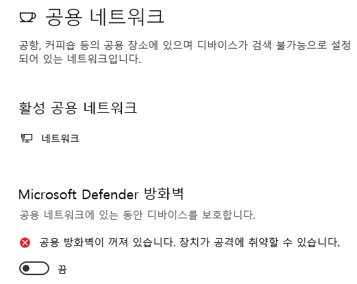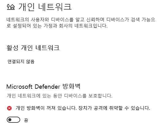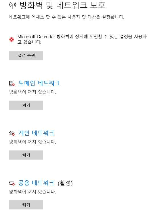 도메인 네트워크를 켬에서 끔으로 변경하였습니다. 개인과 공용 네트워크도 진행합니다.