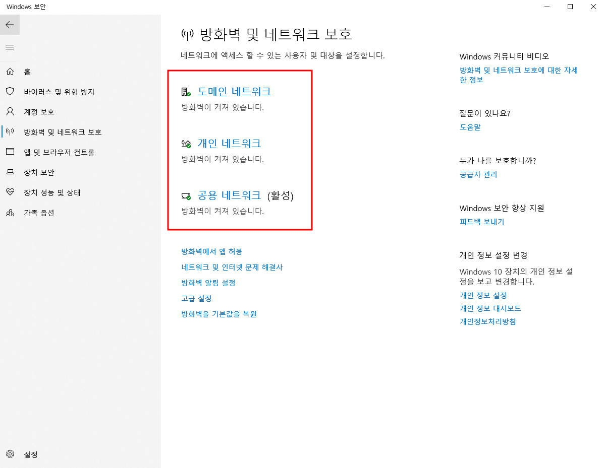 이동을 하면 , 도메인/개인/공유 네트워크 3개가 표시됩니다. 이 상태를 오른쪽 이미지처럼 비활성화를 시켜야 합니다. 각각 하나하나씩 눌러서 변경하겠습니다.