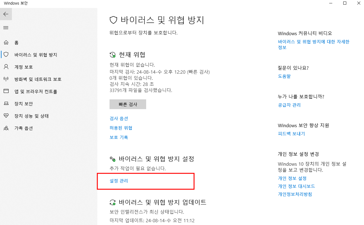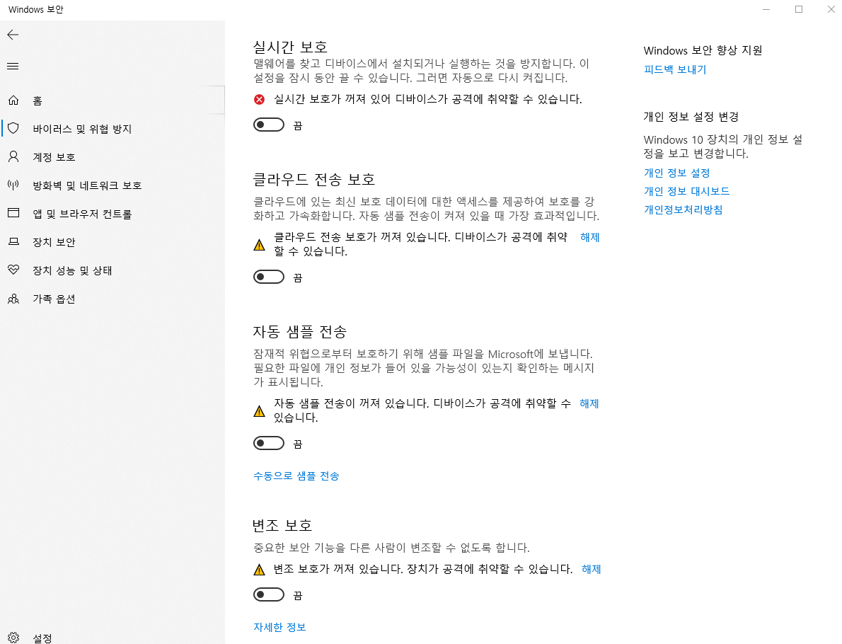 첫 번째 그림에서 빨간 네모박스의 " 설정 관리 "를 눌러줍니다. 그리고 설정창에서 " 실시간 보호 " , " 클라우드 전송 보호 " , " 자동 샘플 전송 " , " 변조 보호 "가 현재 켜져 있습니다.