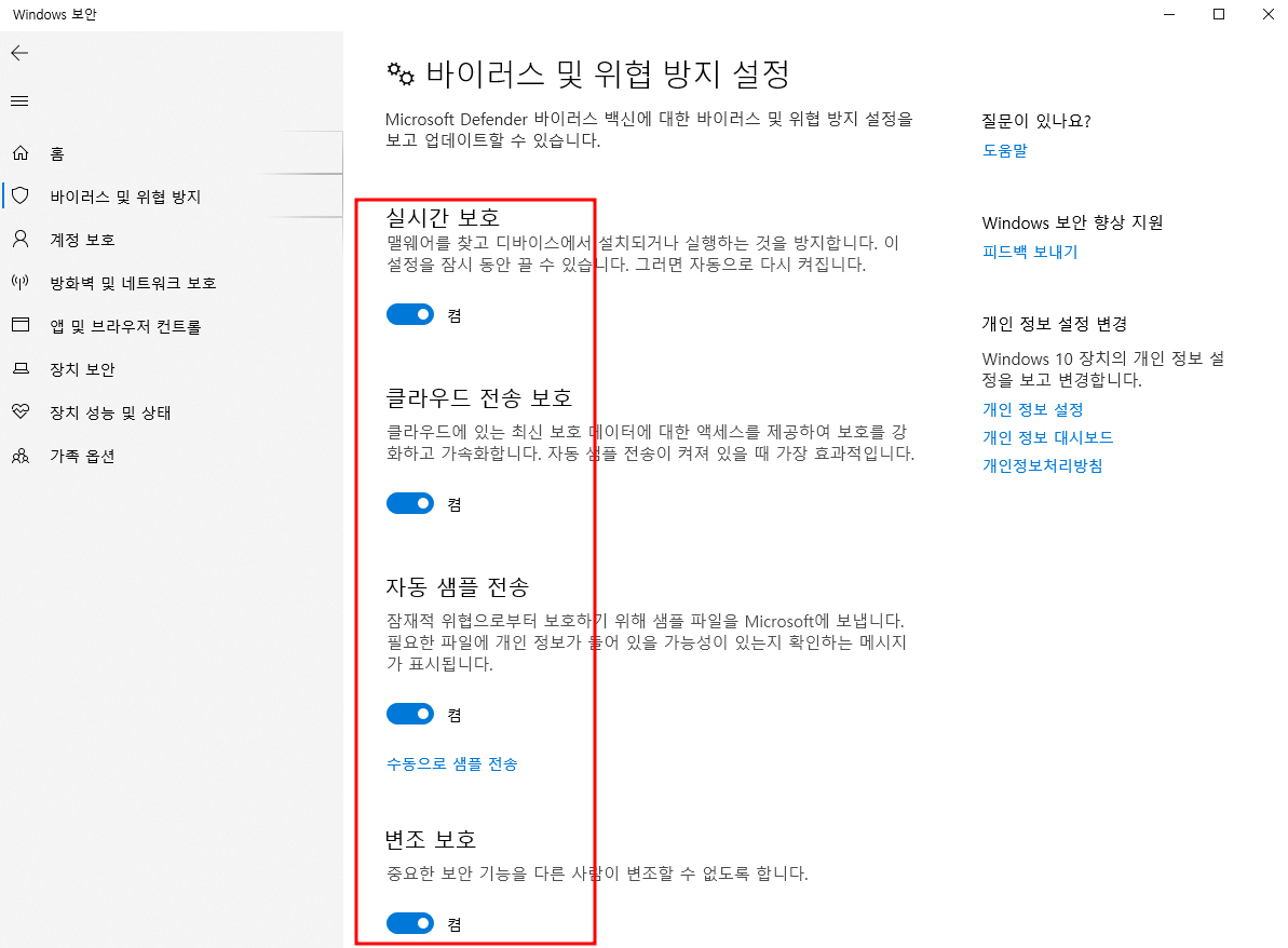 첫 번째 그림에서 빨간 네모박스의 " 설정 관리 "를 눌러줍니다. 그리고 설정창에서 " 실시간 보호 " , " 클라우드 전송 보호 " , " 자동 샘플 전송 " , " 변조 보호 "가 현재 켜져 있습니다.