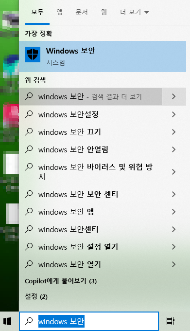 " windows 보안 " 입력(띄어쓰기 정확해야 함)을 하고 눌러주면 윈도우 보안창이 오픈됩니다.