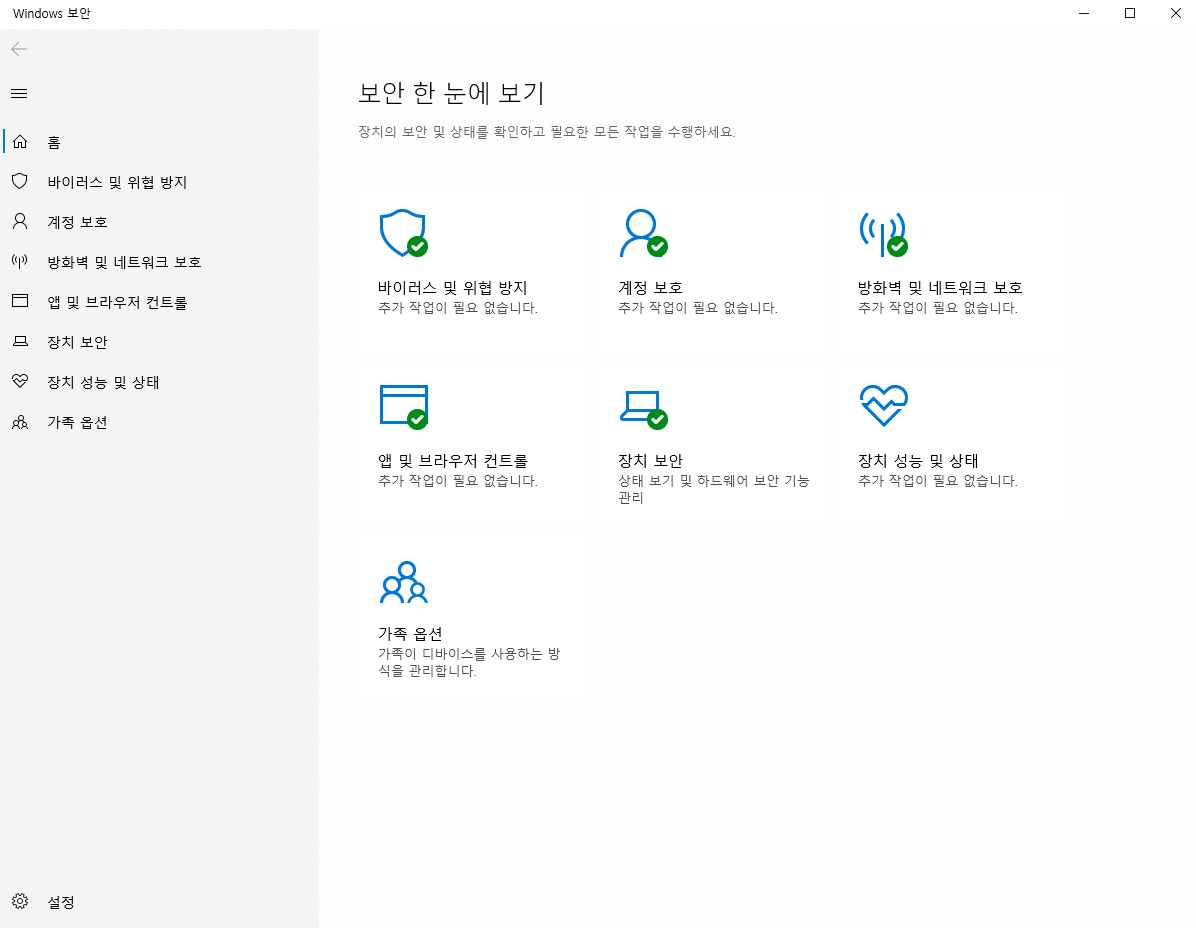 여기서 해제해야 할 부분은 두 곳입니다. " 바이러스 및 위협 방지 " 탭과 " 방화벽 및 네트워크 보호 " 탭입니다. 해제해 보겠습니다. 첫 번째를 클릭하여 이동해 줍니다.