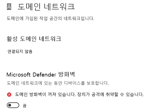 도메인 네트워크를 켬에서 끔으로 변경하였습니다. 개인과 공용 네트워크도 진행합니다.