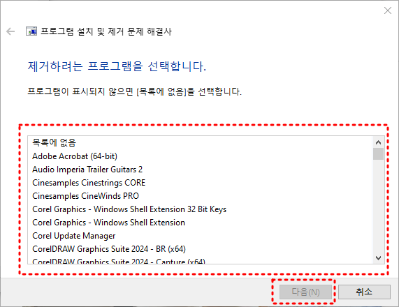 프로그램 선택하기: 제거하고자 하는 프로그램을 선택한 후, 화면의 지시에 따라 진행하면 됩니다. 이 과정은 매우 직관적이어서 쉽게 따라할 수 있습니다. 다음을 눌러 진행합니다.