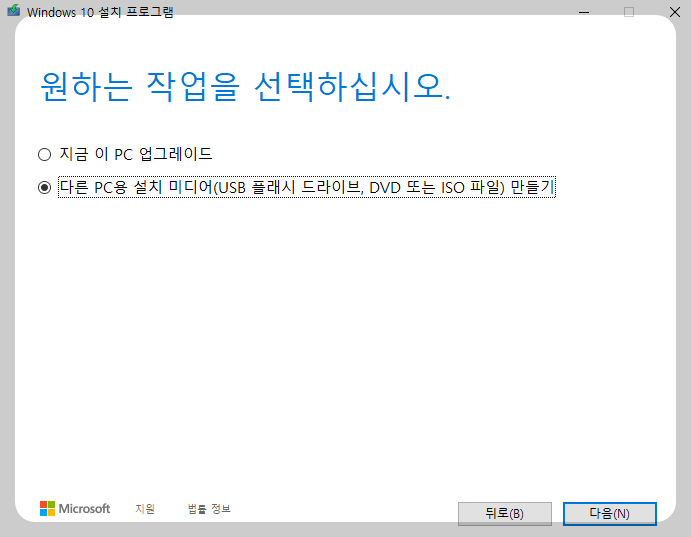 원하는 작업을 선택하라고 나오는데요, 지금 이 PC가 아니라 설치용 usb를 만드는 과정이기에, 위 그림처럼 두번째 거를 선택하고 다음을 눌러주세요.