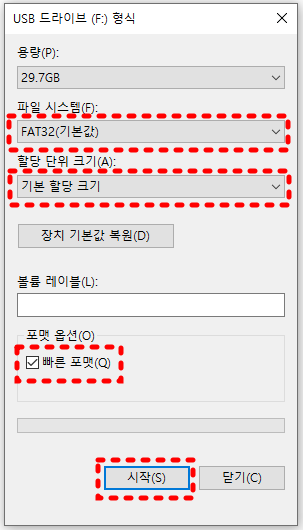 보이는 것 처럼, 파일시스템은 ( FAT32(기본값) ) * NTFS는 일반적으로 사용하실때 이지만, 지금은 설치 USB를 만드는 과정이기때문에 FAT32를 선택하셔야 합니다.