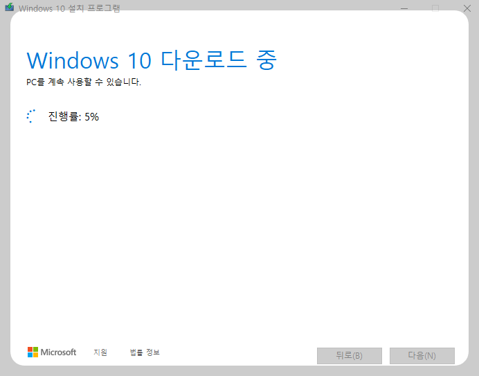 다운로드 중이라는 진행율 현황이 보여지면서 열심히 usb로 설치가 되는 모습을 보게 됩니다. 다운로드 되는 시간은 대략 10분에서 20분 정도면 받아지는 것 같네요. 다운 받는 동안 다른 작업을 하게 되면 속도 저하 문제가 될 수 있고, 혹시라도 모를 오류가 있을 수 있으니 가만이 기다리는 것이 좋을 것 같습니다. ( 저의 컴퓨터 기준으로는 그렇습니다. )