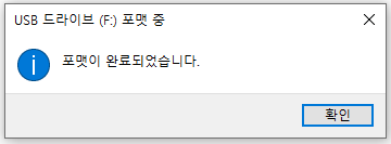 잠시 뒤, 포멧이 완료되었습니다 라는 글일 뜨면 끝난 것입니다. 닫기를 눌러 포맷 창을 끄면 되구요. 이제 준비는 되었습니다. 본격적으로 윈10을 적용하는 방법을 알려드리겠습니다.
