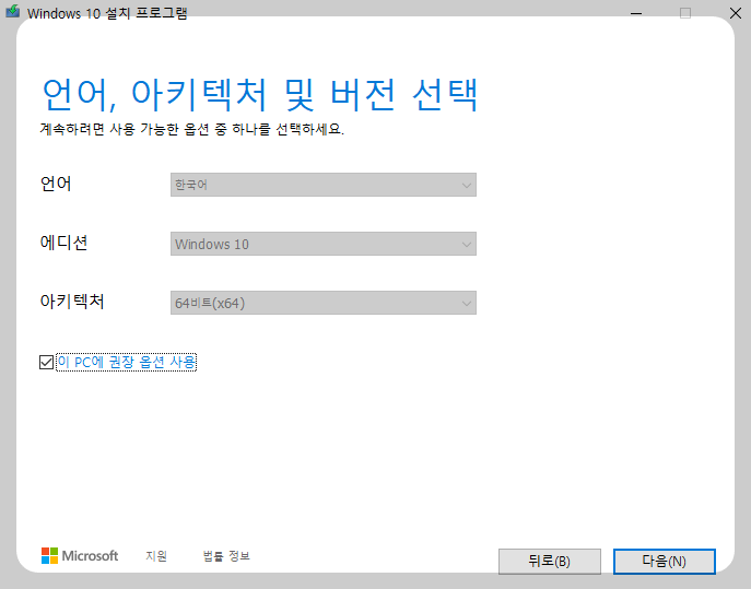 언어는 한국어, 에디션은 10, 아키텍처는 자동으로 디폴트 되어 보여지네요. 만약 권장 옵션 사용 디폴트를 해제하시면 개별 설정이 가능하니 참고하시구요. 다음을 눌러 진행합니다.