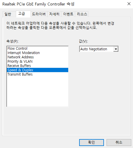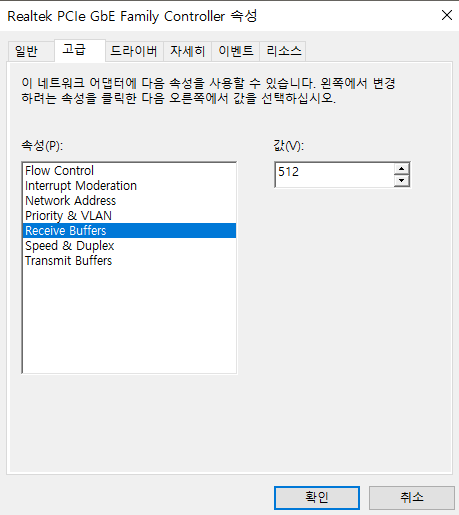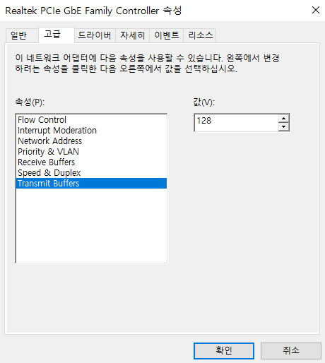 이동이 되었다면 순서대로 receive Buffers / Speed & Duplex / Transmit Buffers 이렇게 3가지를 위와 같이 값을 정렬해줍니다. 값을 올리게 되면 메모리 부담이 되어서 오히려 버벅일 수 있어서 최적의 기본값이 다르거나, 또는 컴퓨터 성능이 나는 좀 된다 하시면 올리시면 되구요. 다만, 무작정 올리는 것이 아니라, 단계적으로 올려야 합니다. 저처럼 적정 수치로 하는 것을 권장합니다.